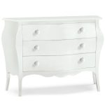 Die matt-weiß lackierte Oberfläche und die originellen Knäufe unterstreichen das geschwungene Retro-Design.