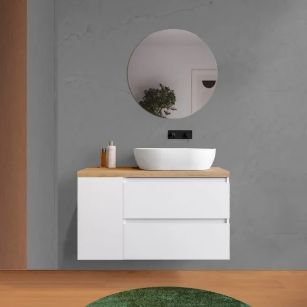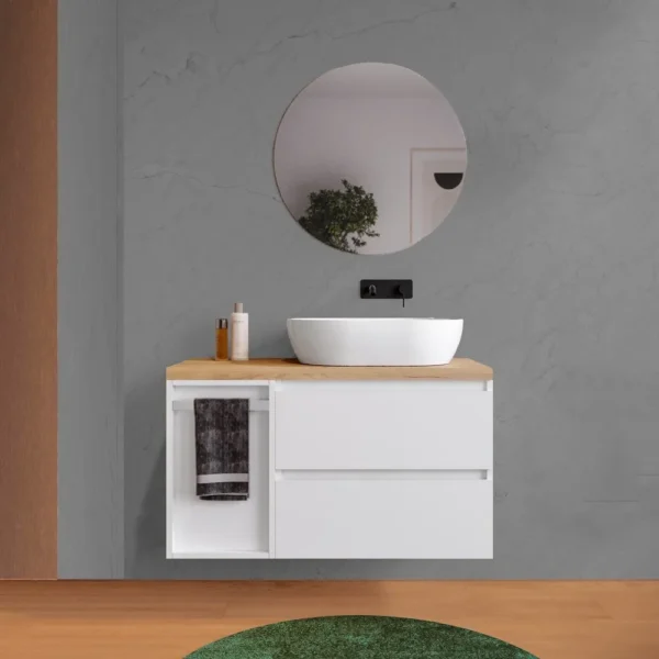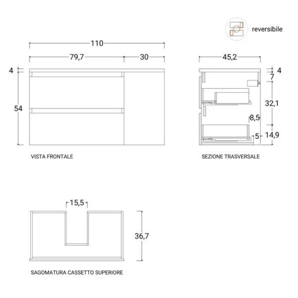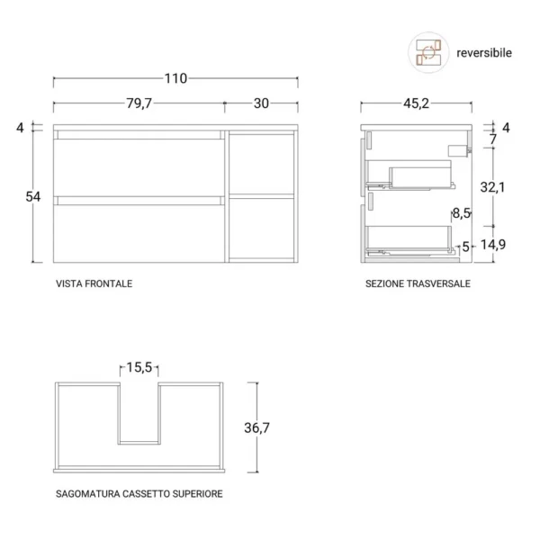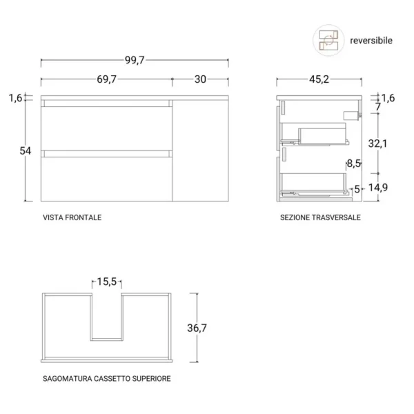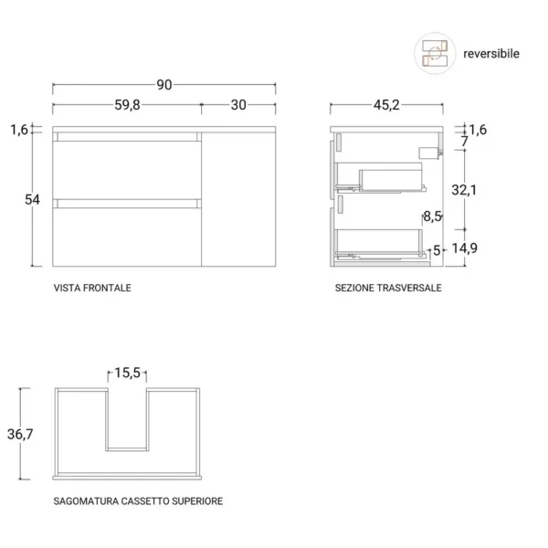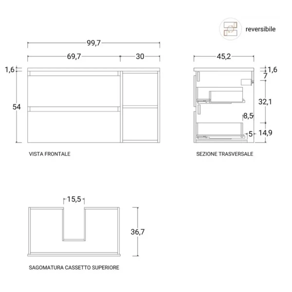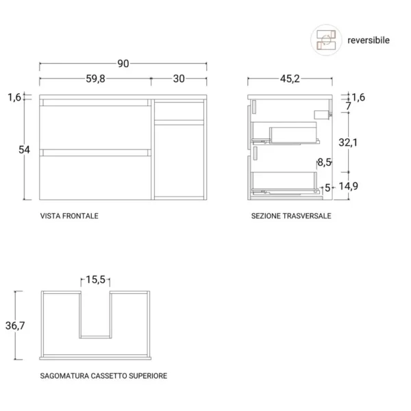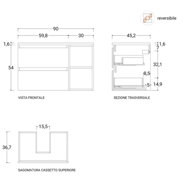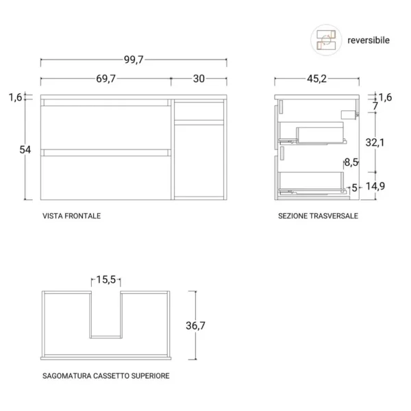 LUKE3′ Waschtischunterschrank mit REVERSIBLER Tür/Schublade/Wanne