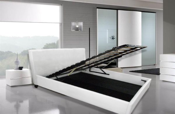 Unter dem Lattenrost ist ein praktisches Ablagefach verborgen, das Dank der auf dem Metallgitter angebrachten Kolben leicht geöffnet werden kann. So können Sie alles, was Sie für Ihr Schlafzimmer benötigen, platzsparend aufbewahren .