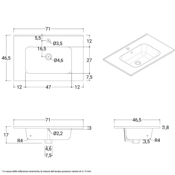 Keramik-Waschtisch in Weiß glänzend, mit Hahnloch und Überlaufloch