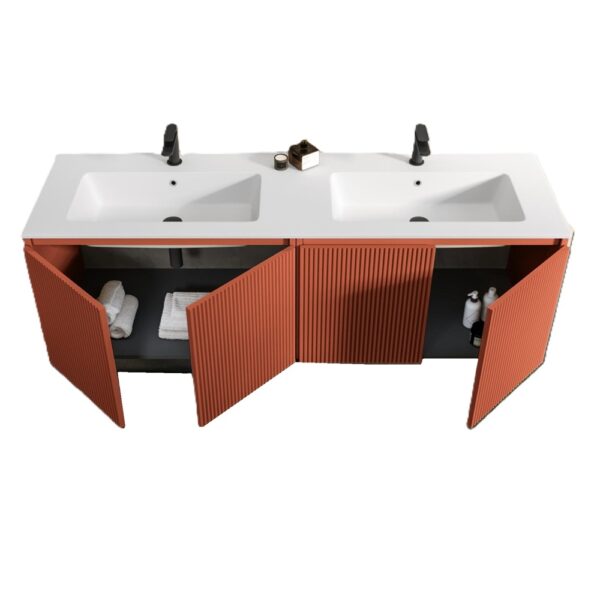 Wandhängender Badezimmerschrank mit Doppelwaschbecken und vier Türen. Erhältlich in folgenden Farben: Mattweiß, Dunkle Eiche, Betongrün, Goldeiche, Zuckerpapier, Anthrazit, Terrakotta mit Rippeneffekt. Der Spiegel ist im Preis inbegriffen.