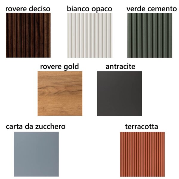Erhältlich in folgenden Farben: Mattweiß, Dunkle Eiche, Betongrün, Goldeiche, Zuckerpapier, Anthrazit, Terrakotta