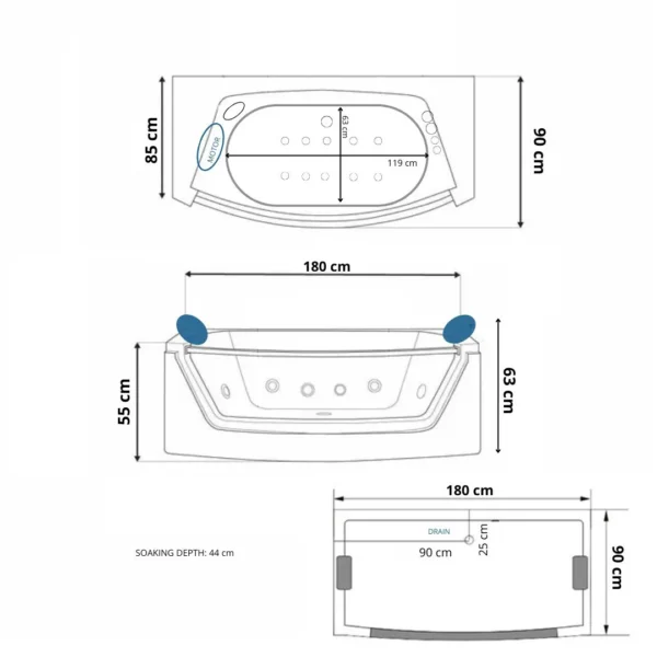 14 Hydromassagedüsen (4 große und 10 kleine)