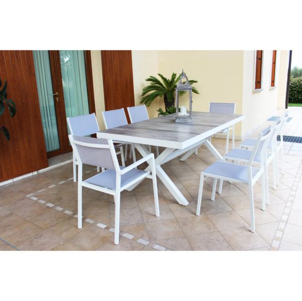 NB: Über das Dropdown-Menü können 4 bis 12 Stühle für die Modelle Anthrazit und Weiß kombiniert werden, die aus einem Aluminiumgestell mit Sitz und Rückenlehne aus Textilene bestehen (Maße weißer Stuhl: 55x57xH85cm; Maße anthrazitfarbener Stuhl: 56x61xH84cm)