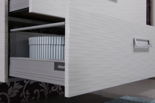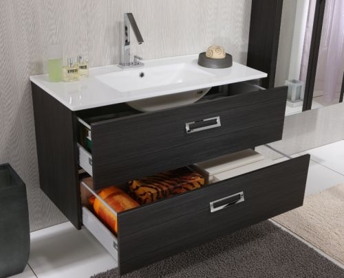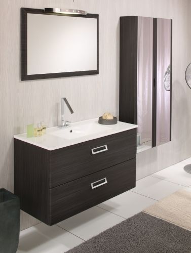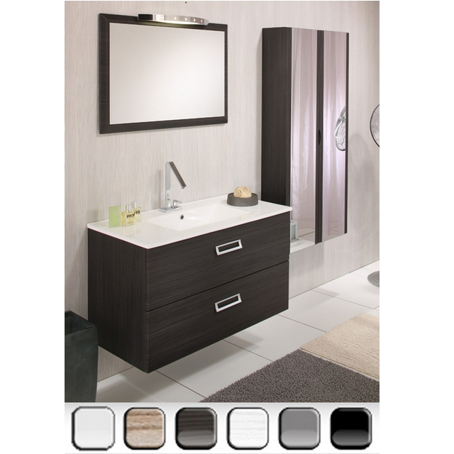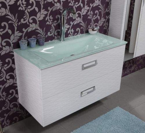 The piece of furniture is suspended, but it is also possible to install chromed feet.