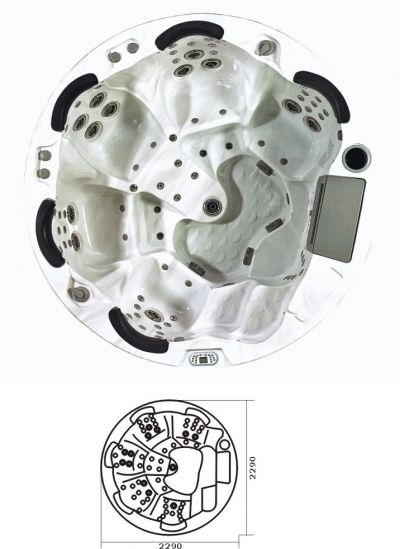 MEASURES: 2290 x 2290 x 940 mm, MATERIAL: ACRYLIC (reinforced resin glass), EXTERNAL COVERING: PVC WOOD EFFECT, INSULATION IN EXPANDED PULIORETHANE, 2 HYDROMASSAGE PUMPS (2.25kw 3hp), AIR PUMP (0.25kw), RECIRCULATION PUMP ( 0.5kw), HEATER max 40 ° (3kw), OZONISER, 2 SKIMMER FILTERING SYSTEMS (filters), COMPUTERIZED CONTROL UNIT BALBOA SYSTEM CONTROL (USA), ELECTRIC SYSTEM WITH INTEGRATED HEAVY, LED CIRCULAR LIGHTING (20 LEDs), LED HEADLIGHT SUBAQUEO, RADIO, 2 SPEAKERS, 2 JETS ADJUSTABLE REGULATORS, 4 JETS INTENSITY JETS, 13 JETS DIFFERENT DIRECTIONS, 53 JETS SMALL SIZES, 10 AIR JETS, CASCADE, 5 SEATS, 1 LOUNGE, 5 HEADRESTS, VACUUM WEIGHT 300kg, VOLUME D ‘WATER 1.4 m3, CE CERTIFICATION, WARRANTY YEARS 2. OPTIONAL: LADY PVC WOOD LADDER, ISOTHERMAL COVER.