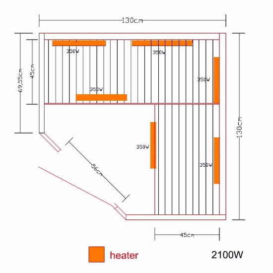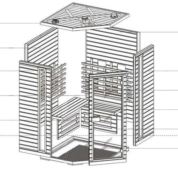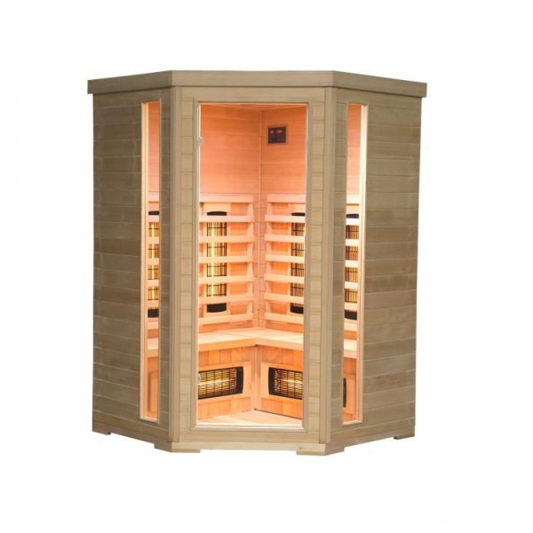 It is a model designed for two people, which is easy to position due to its optimised dimensions and structure for corner installation. The sauna has 2100w power and is equipped with 6 infrared heating elements; the door and window are made of tempered glass. It is equipped with some optional extras such as two controls per zone, chromotherapy (in the colours white, red, green, blue), radio with amplifier, fan, mp3 player, digital control panel.