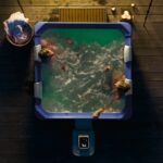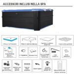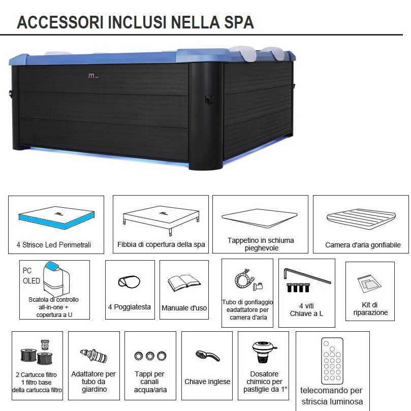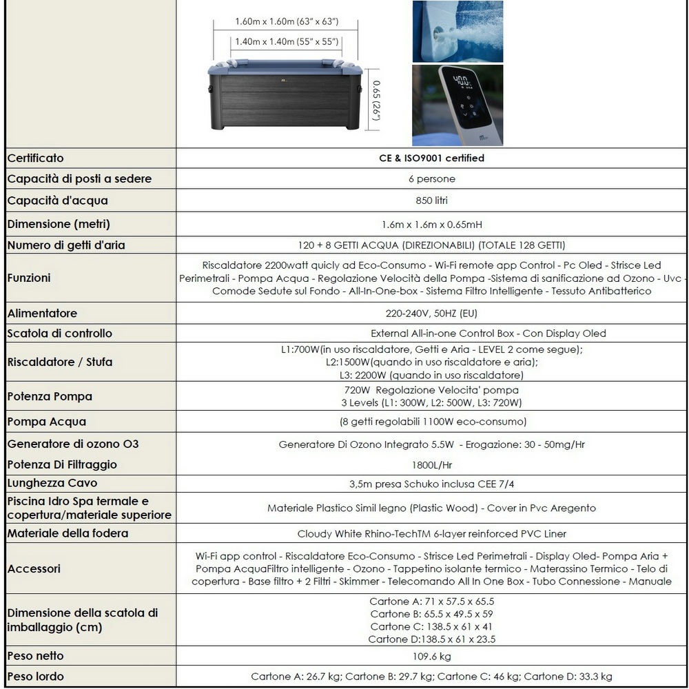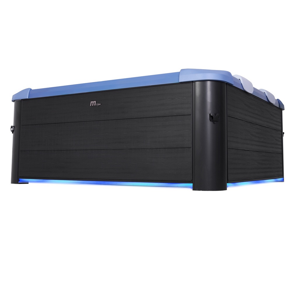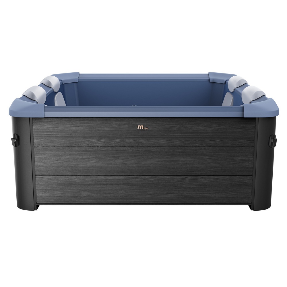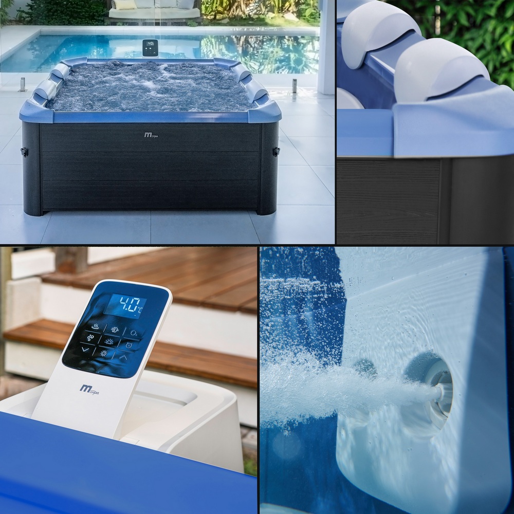 Square outdoor tub, suitable for 5-6 people, featuring a metallic blue interior. Complete with whirlpool and airpool jets, perimeter LED strips, ozone generator, Wi-Fi for remote control via app, and heater.