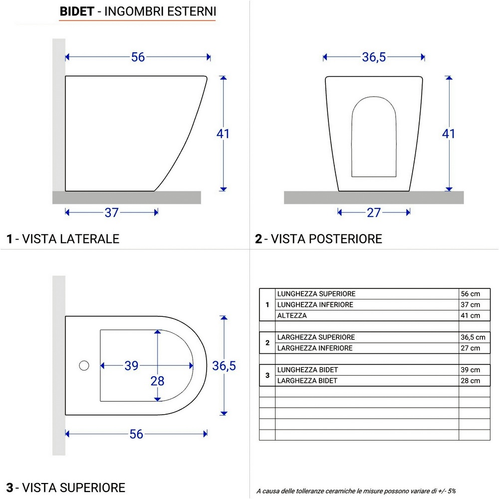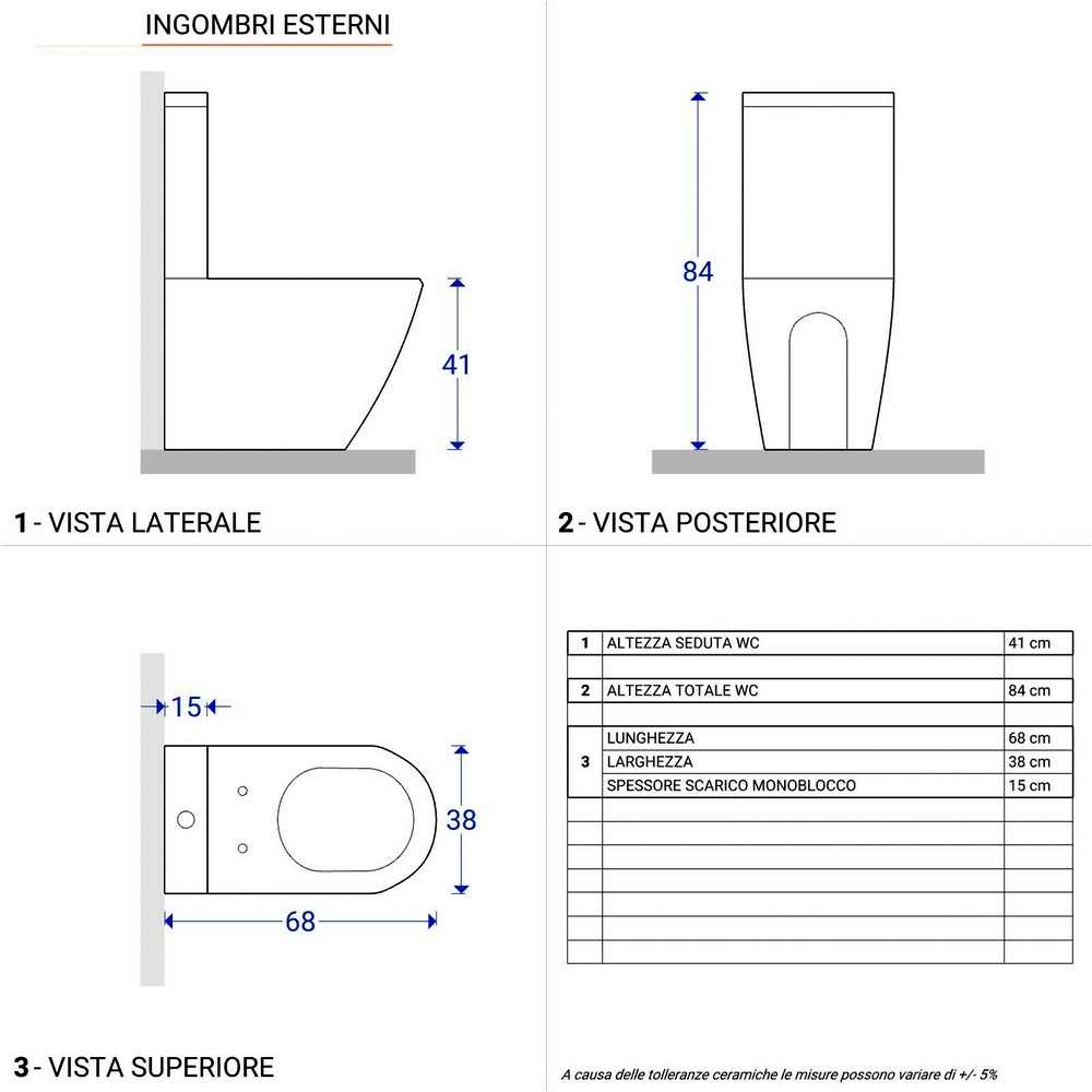 Monoblock toilet: 38xD68 cm (total height 84 cm; seat height 41 cm)