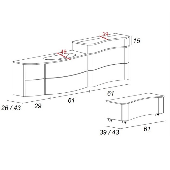 – the chest of drawers WITH WHEELS with 1 drawer, 62xH23,8 cm depth 39/43 cm (the height refers to the base only, without wheels) or with 2 drawers