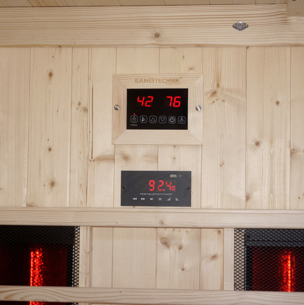 Cabaña con estructura térmica de abeto y techo asfáltico, con 4 radiantes infrarrojos y estufa Harvia. Luz LED para cromoterapia y altavoz con conexión Bluetooth.