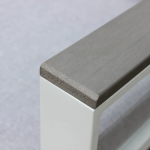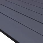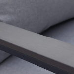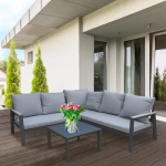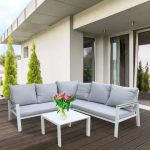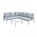 Moderno conjunto de exterior, disponible en dos colores, con estructura de aluminio. El conjunto incluye mesa, sofá esquinero y cojines para asiento y respaldo.