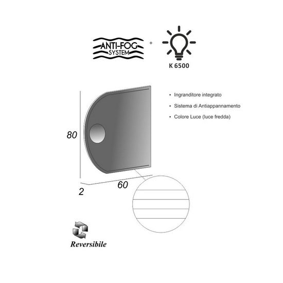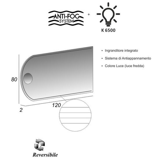 los espejos de 60×80 y 120×80 cm tienen iluminación LED en forma de franjas y están equipados con una lupa y un sistema antivaho (anti-fog).