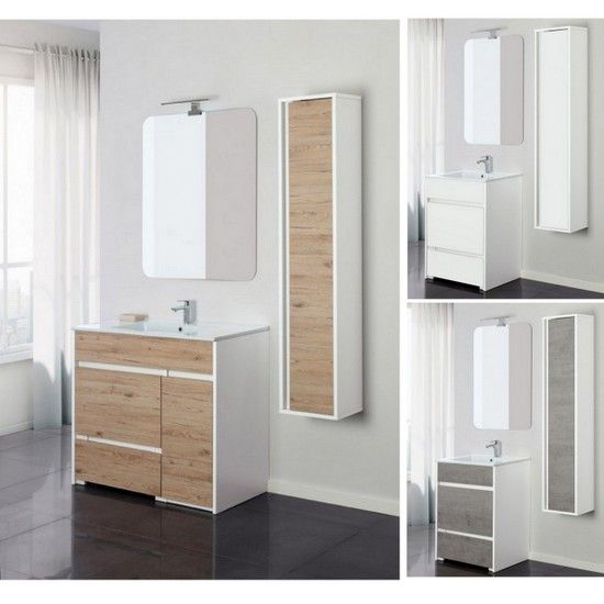 Muebles de Baño Fanny de 60 o 90 cm, sobre el suelo, disponible en roble, blanco o cemento, incluye con espejo.