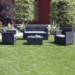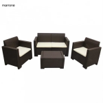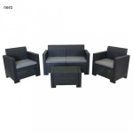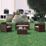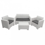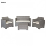 Mobiliario de jardín con capacidad para 4 personas, compuesto por un sofá, dos sillas y una mesa. La estructura es de plástico moldeado con efecto de mimbre, en blanco, marrón, negro o gris tórtola a elegir. La oferta incluye los cojines de los asientos.