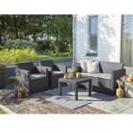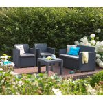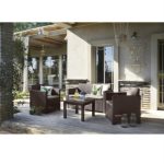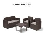 Salón de exterior disponible en marrón o grafito; compuesto por un sofá de dos plazas, dos sillones y una mesa de centro. Fabricado en resina resistente a los impactos con efecto poliratán.