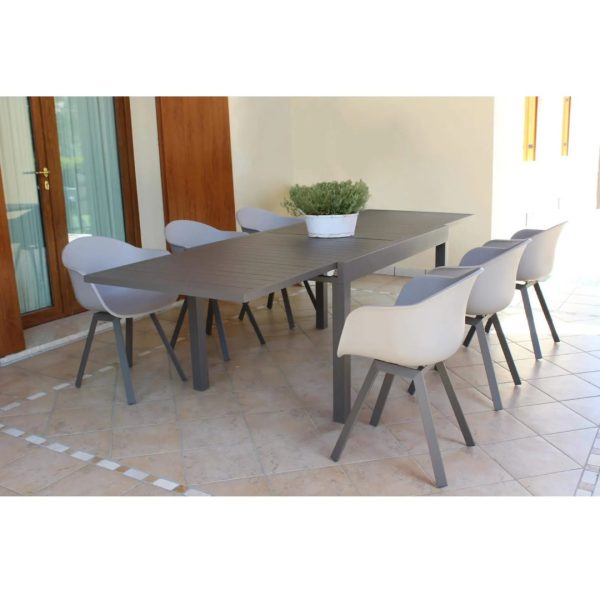 NB: Sillas no incluidas en la oferta; es posible combinar de 4 a 12 sillas (con estructura de aluminio y asiento de polipropileno, 63x55xH79cm) seleccionándolas en el menú desplegable.