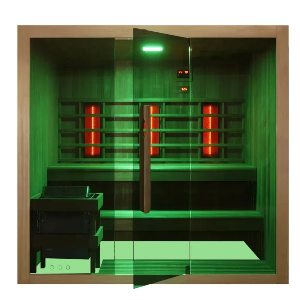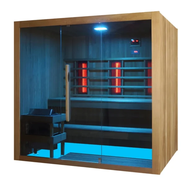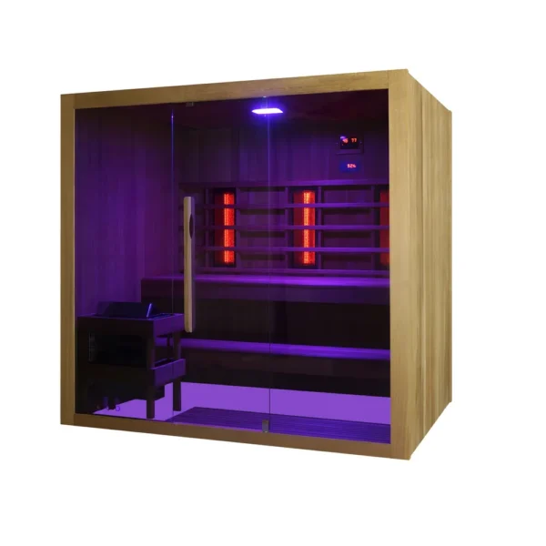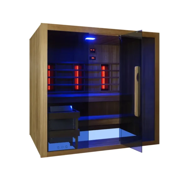 Sauna combiné, composé de 3 radiateurs infrarouges de 300W chacun et d’un poêle de 6kW. Les fonctions comprennent également la connexion Bluetooth et la thérapie par les couleurs, grâce à des diodes électroluminescentes à 7 variations de couleurs.