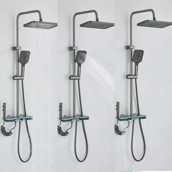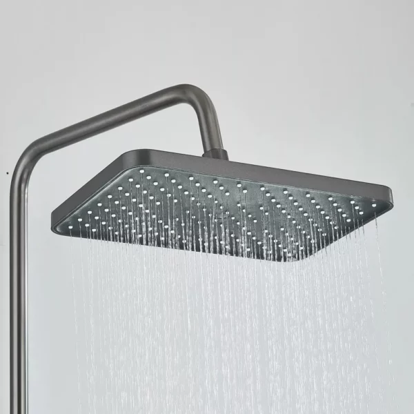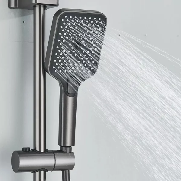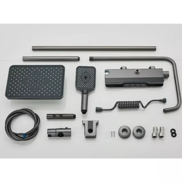Ensemble de douche moderne, avec douche de tête centrale, douchette latérale, robinet de baignoire inférieur et douchette à main. Fabriqué en aluminium avec des détails en plastique, de couleur grise.
