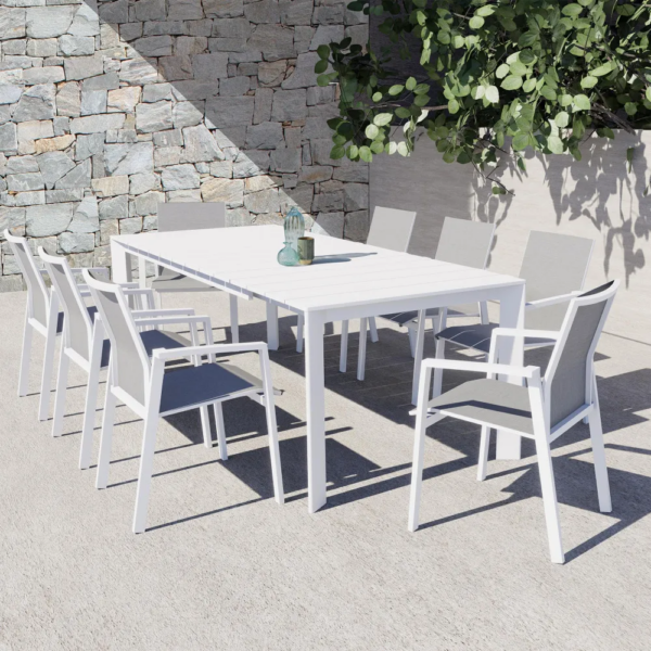 NB : chaises non incluses dans le prix, vous pouvez les ajouter via le menu déroulant (57x61xH89cm, en aluminium avec assise et dossier en textilène)