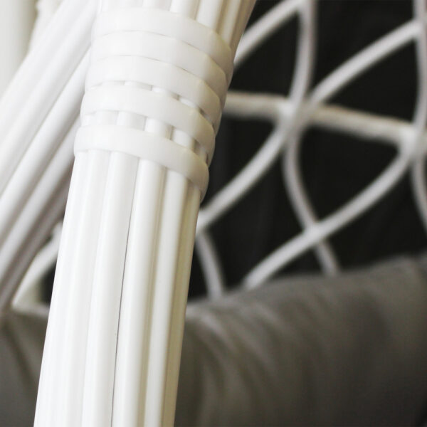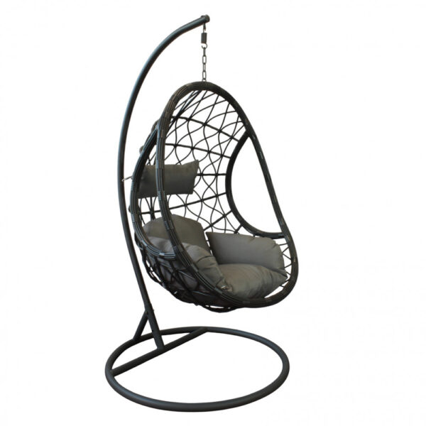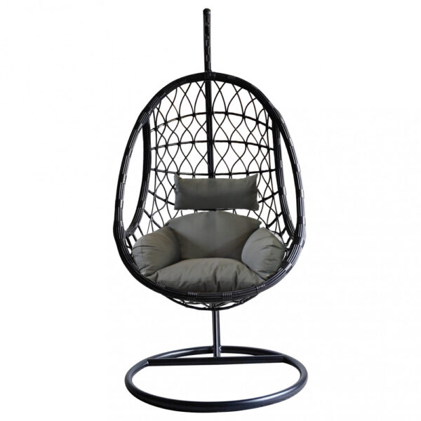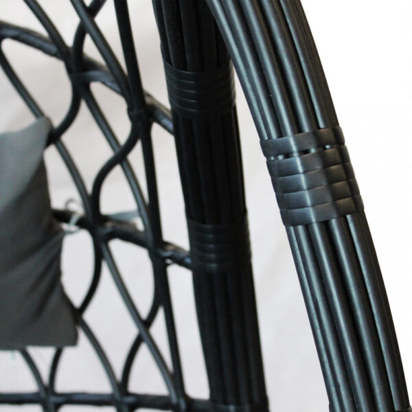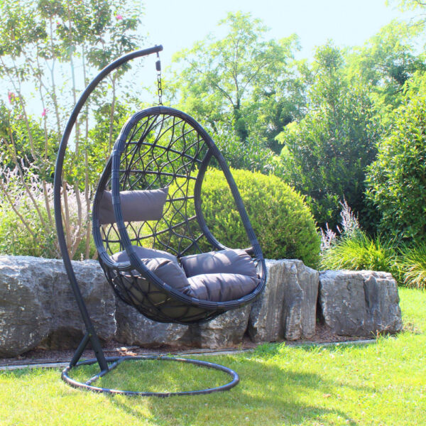 Élégante balancelle de jardin et d’extérieur, fabriquée en osier (quatre coloris au choix) et soutenue par une structure métallique robuste. Coussin en polyester inclus.
