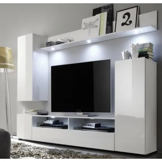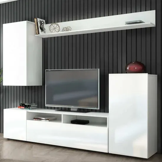 Meuble TV composé de compartiments ouverts et de portes. Fabriqué en bois stratifié blanc brillant/blanc.