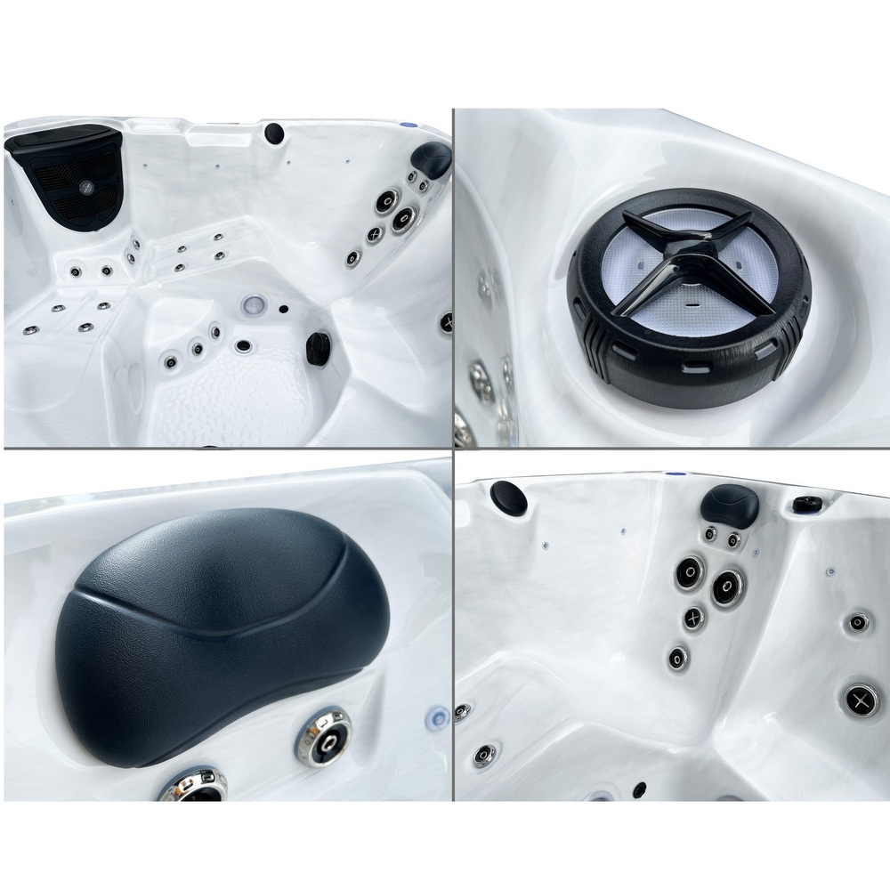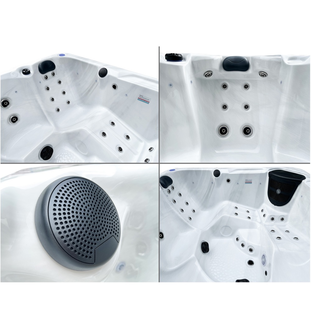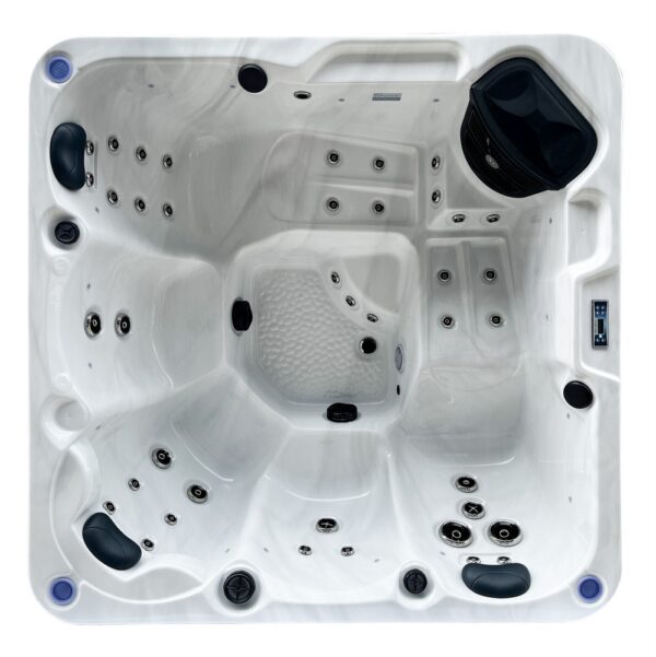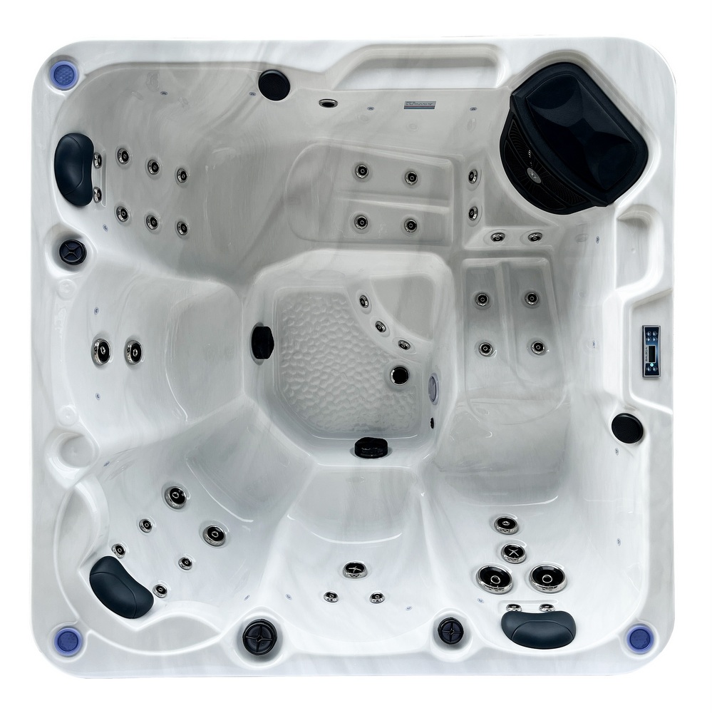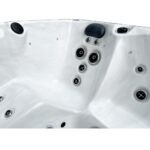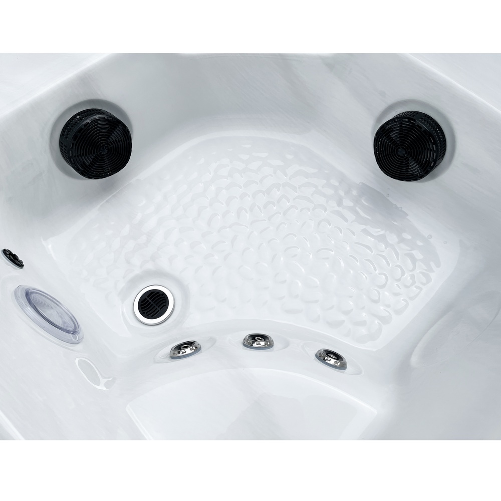 Piscine extérieure carrée pouvant accueillir jusqu’à 6 personnes. Équipée de LED de chromothérapie, d’un ordinateur tactile avec Bluetooth, d’un chauffage Balboa et d’un système d’ozonothérapie.