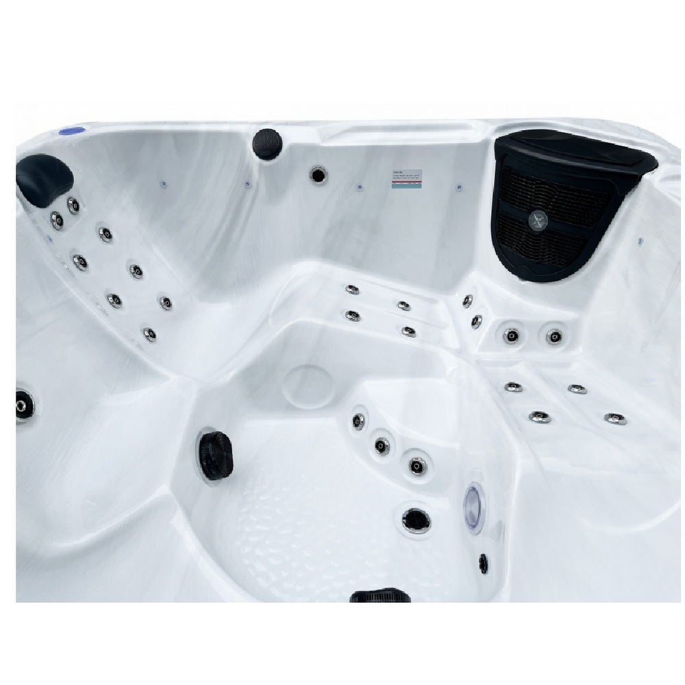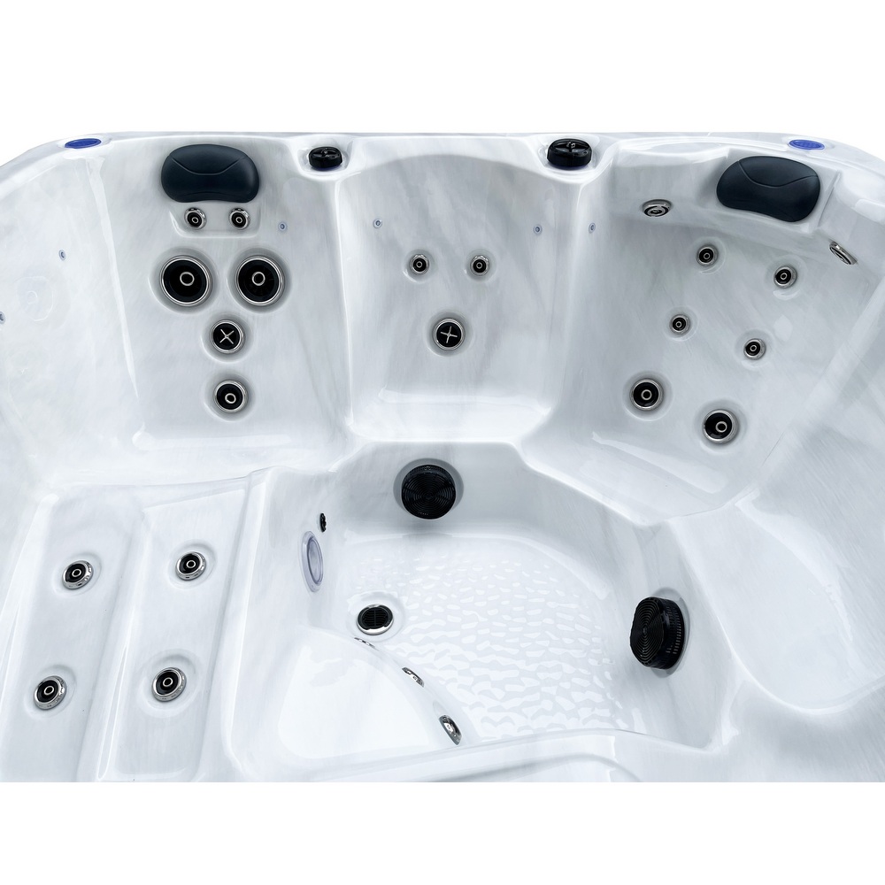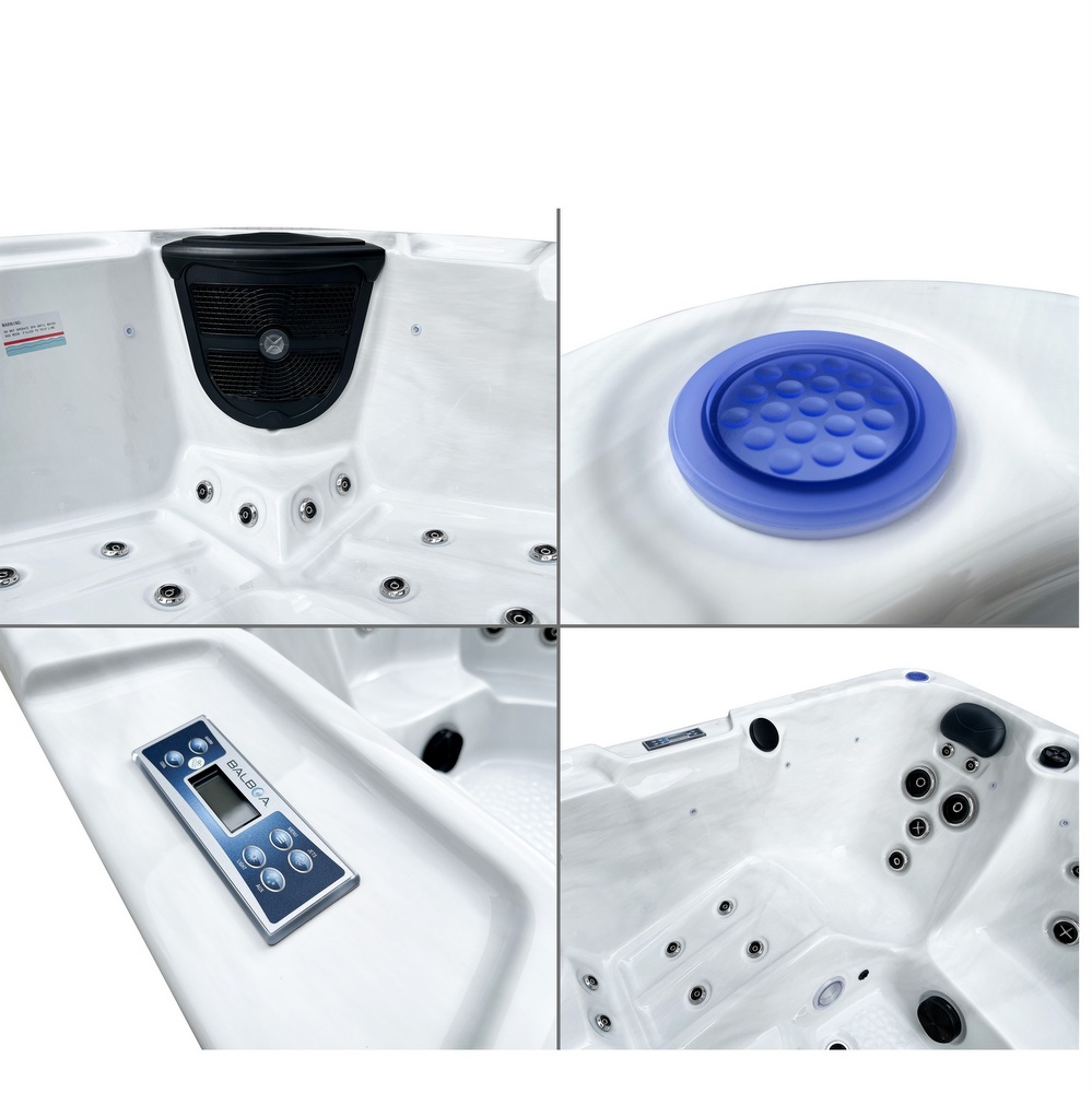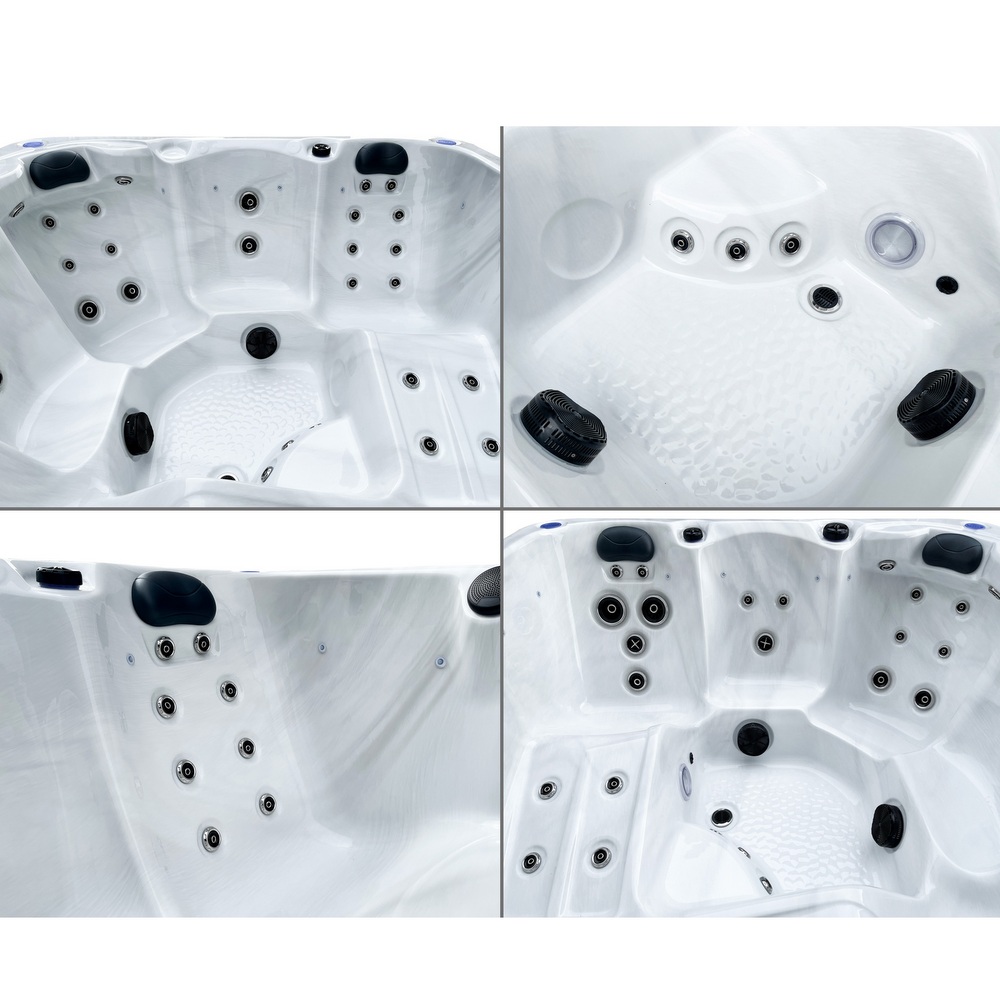 Piscine extérieure carrée pouvant accueillir jusqu’à 6 personnes. Équipée de LED de chromothérapie, d’un ordinateur tactile avec Bluetooth, d’un chauffage Balboa et d’un système d’ozonothérapie.