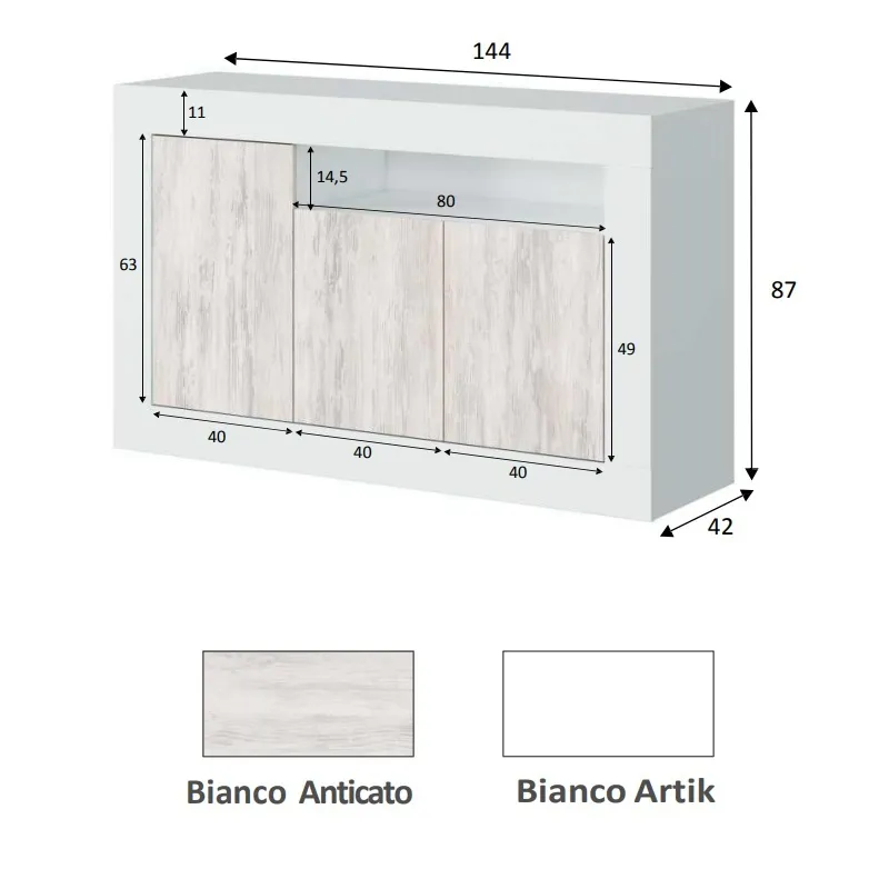 Meuble moderne bicolore avec structure en artik blanc et façades en blanc antique. Composé de 3 portes avec étagères intérieures et d’un compartiment ouvert pratique.