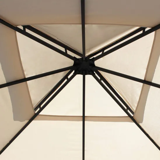Grande gloriette pour l’aménagement de jardins, terrasses et espaces extérieurs. Structure en métal anthracite et toile en polyester ivoire.