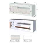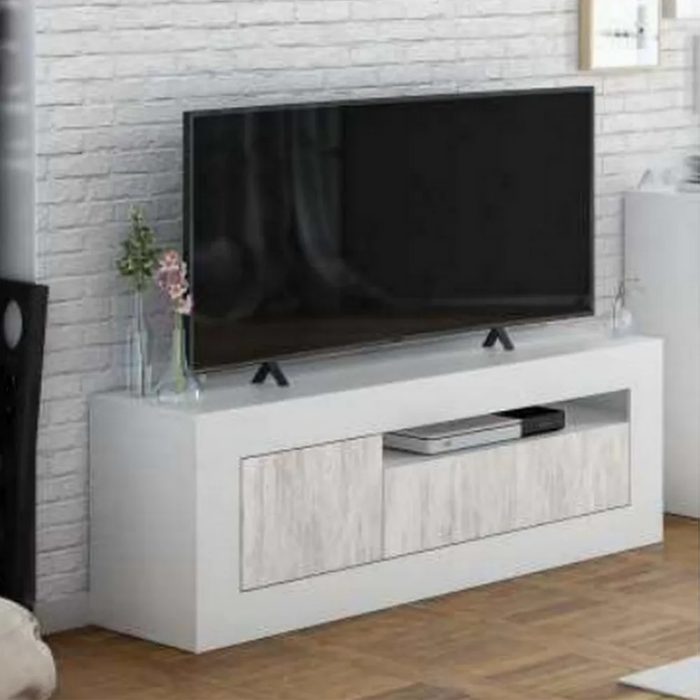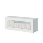 Meuble moderne pouvant servir de meuble TV, avec une structure en artik blanc et des façades de porte blanc antique. Composé d’une porte battante, d’un compartiment ouvert et d’une porte à rabat.
