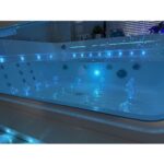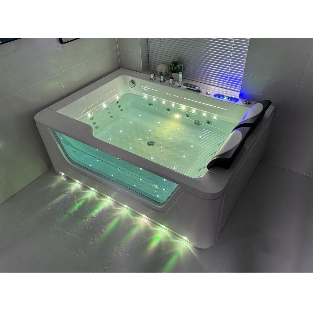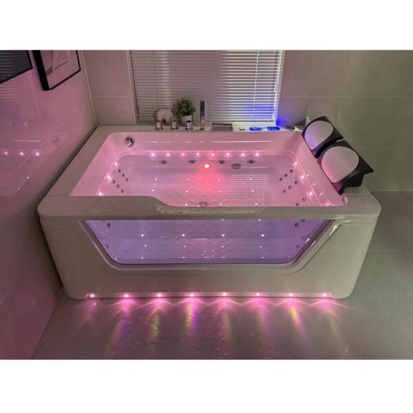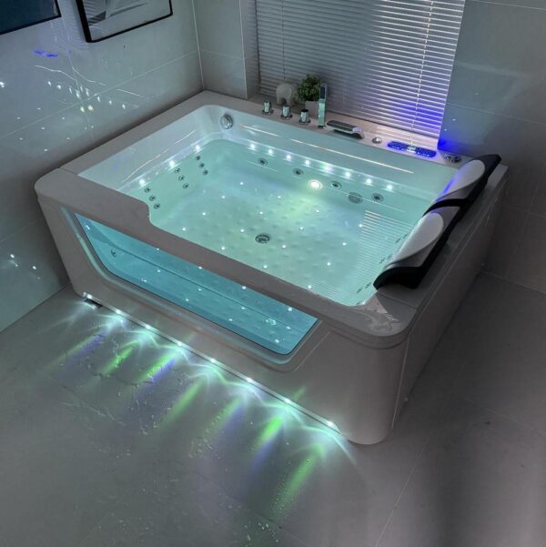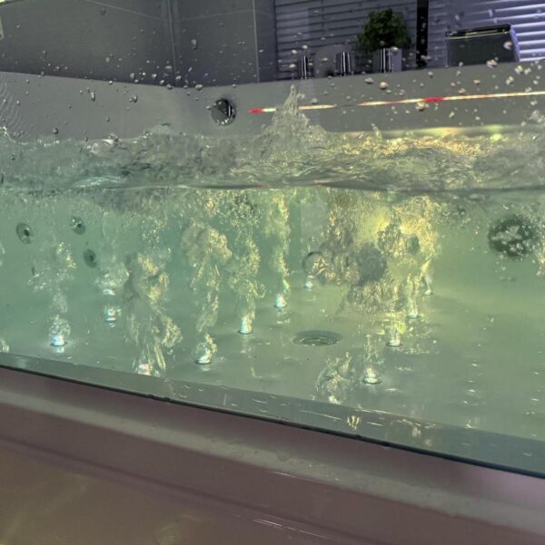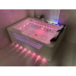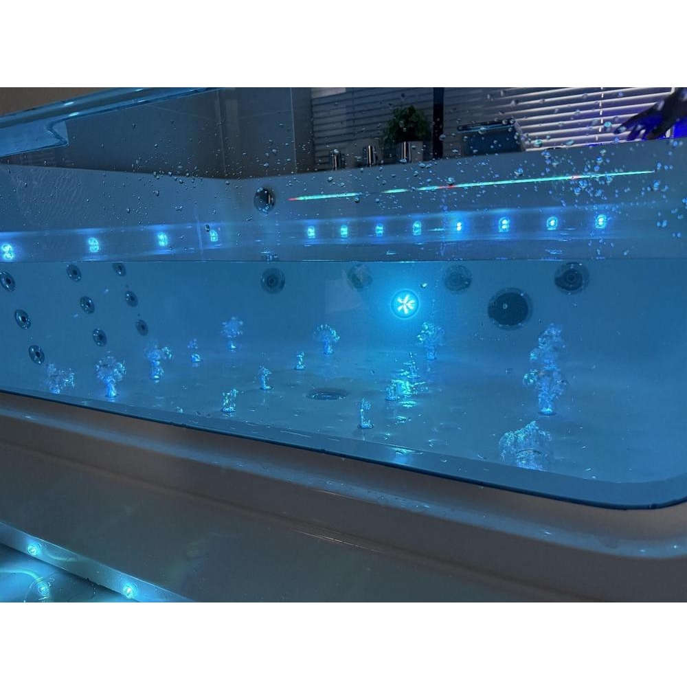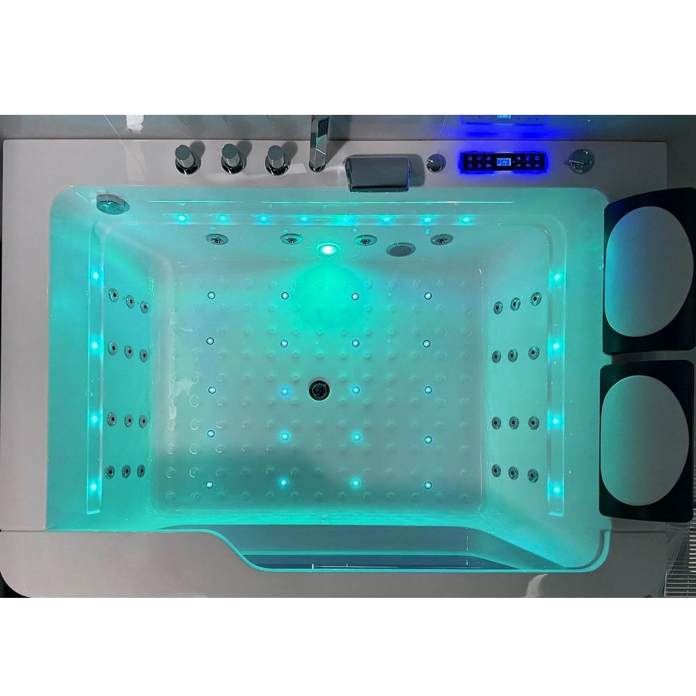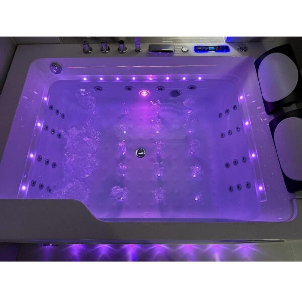 Baignoire balnéo complète équipée de deux pompes airpool et balnéo pour un total de 50 jets : 20 jets d’air rétroéclairés (air-led) et 30 jets d’eau. Elle dispose également d’une connectivité Bluetooth, d’une chromothérapie et d’un chauffage.