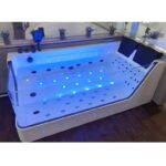 Baignoire d’angle pour deux personnes composée d’un cadre en acier, de panneaux acryliques à 4 couches et de verre trempé incassable de 16 mm.